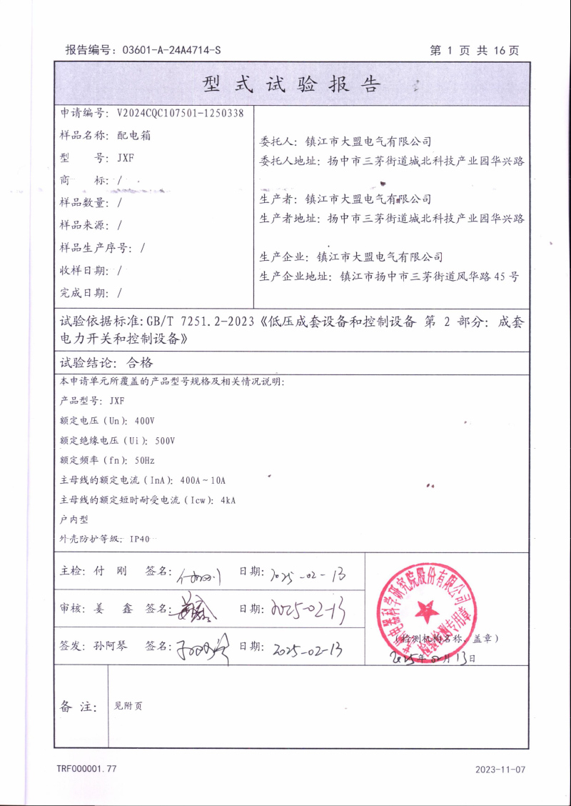 JXF配电箱型式试验报告